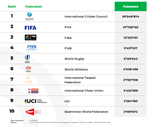 En effet, pour la première fois en quatre ans, le classement de BCW Sports prend à la fois en compte les fédérations internationales de sports olympiques mais aussi non-olympiques. Ainsi, ce sont 120 fédérations internationales qui ont été passées en revue sur Instagram, Facebook, Twitter, LinkedIn, YouTube, Périscope et TikTok dans le but de déterminer l’empreinte des réseaux sociaux des fédérations sportives internationales.
