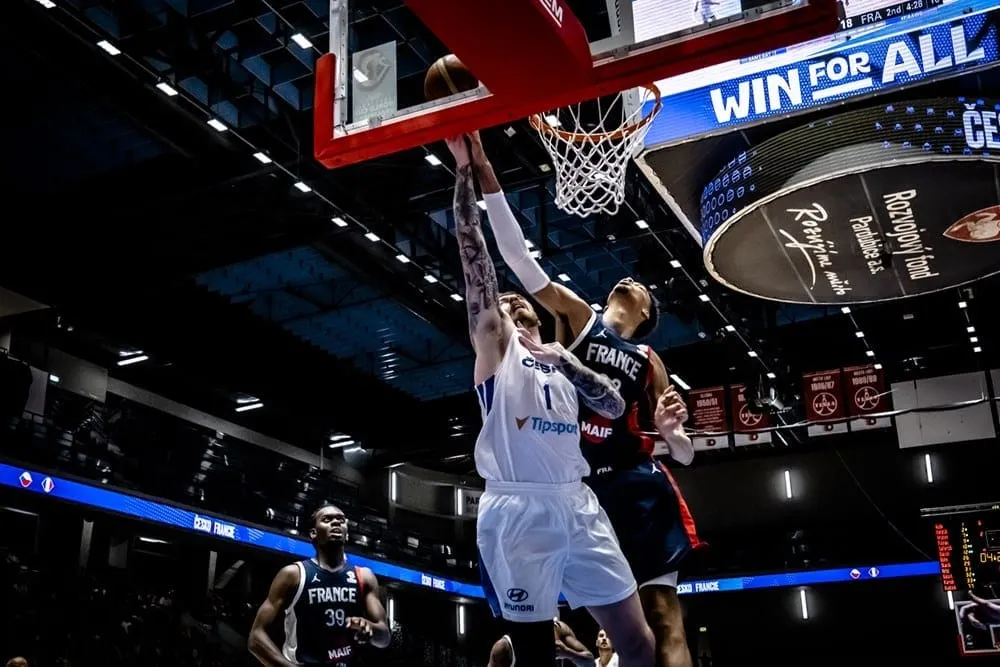 Il fallait attendre 4'40 pour voir le premier panier des Bleus via Wemby, qui se faisait ensuite dunker férocement dessus par Ondrej Balvin -une action qui faisait instantanément le tour du globe sur les réseaux sociaux, la rançon de la gloire-, et qui sur une action suivante faisait un airball en fin de possession. Malgré un bon apport du placide Hugo Benitez et du vigoureux Sylvain Francisco, un écart maximal de 16 points était constaté à la fin du premier quart-temps (27-11) avec une stat frappante : 71,4% de réussite pour les Tchèques contre 23,5 pour les Français.