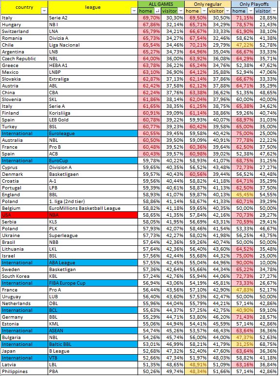Résultats: en cumul, c’est en Serie A2 italienne où l’avantage du terrain est le plus sensible (69,7%) devant la Hongrie (67,8%) et la Suisse (65,7%). Si l’on ne prend que la saison régulière, c’est la Liga Nacional du Chili qui est en tête (70,2%) et si on ne s’intéresse qu’aux playoffs, c’est l’ABA League -la ligue Adriatique- qui est numéro 1 avec 90,0%, ce qui est évidemment énorme d’autant qu’en saison régulière les équipes ne gagnent que… 55,0% des rencontres. Une curieuse disparité.