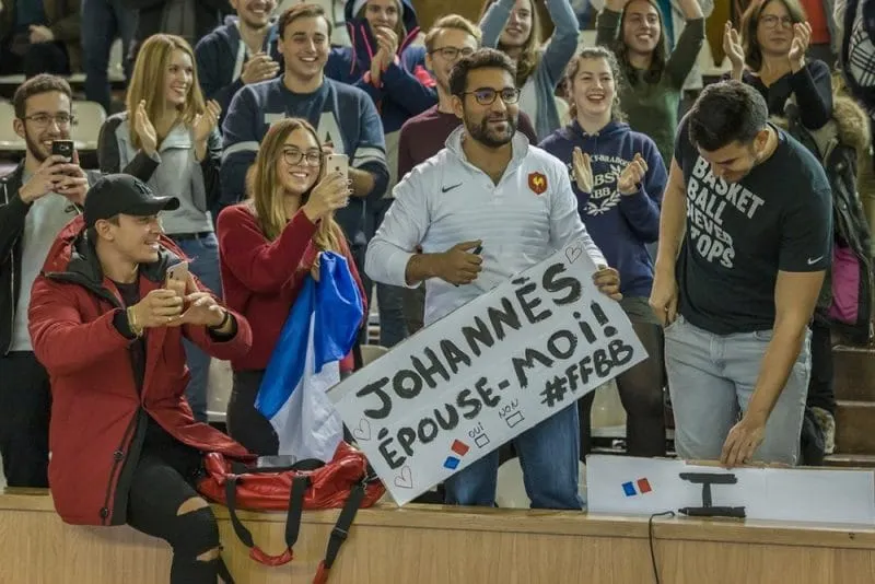 A l’américaine, un des supporters probablement français -il s’agit d’un maillot de rugby des Bleus- présents hier à Cluj pour le match France-Roumanie a confectionné une pancarte pour faire une demande en mariage à Marine Johannès… En inscrivant deux cases. OUI et NON.