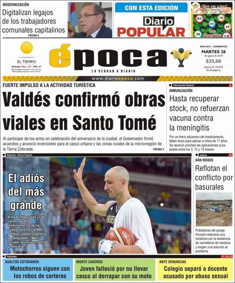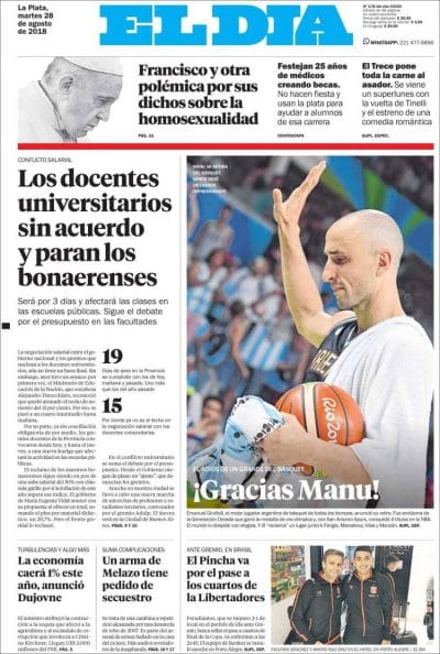 Même si tout le monde s’y attendait -il vient de fêter ses 41 ans-, l’annonce de la retraite de Manu Ginobili a créé un choc dans la communauté mondiale du basket et tout spécialement en Argentine. El Manu y est un héros et il se retrouve à la Une de tous les quotidiens du pays, même ceux pour qui le sport n’est pas une priorité.