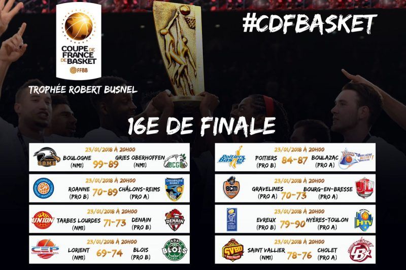 C’est la surprise de taille de cette soirée de 16e de finale de Coupe de France: Saint-Vallier Basket Drome, leader de NM1, a éliminé Cholet Basket, nouvellement qualifié pour la Leaders Cup: 78-76. Lire le résumé complet du match par notre journaliste sur place, Romain Davesne.