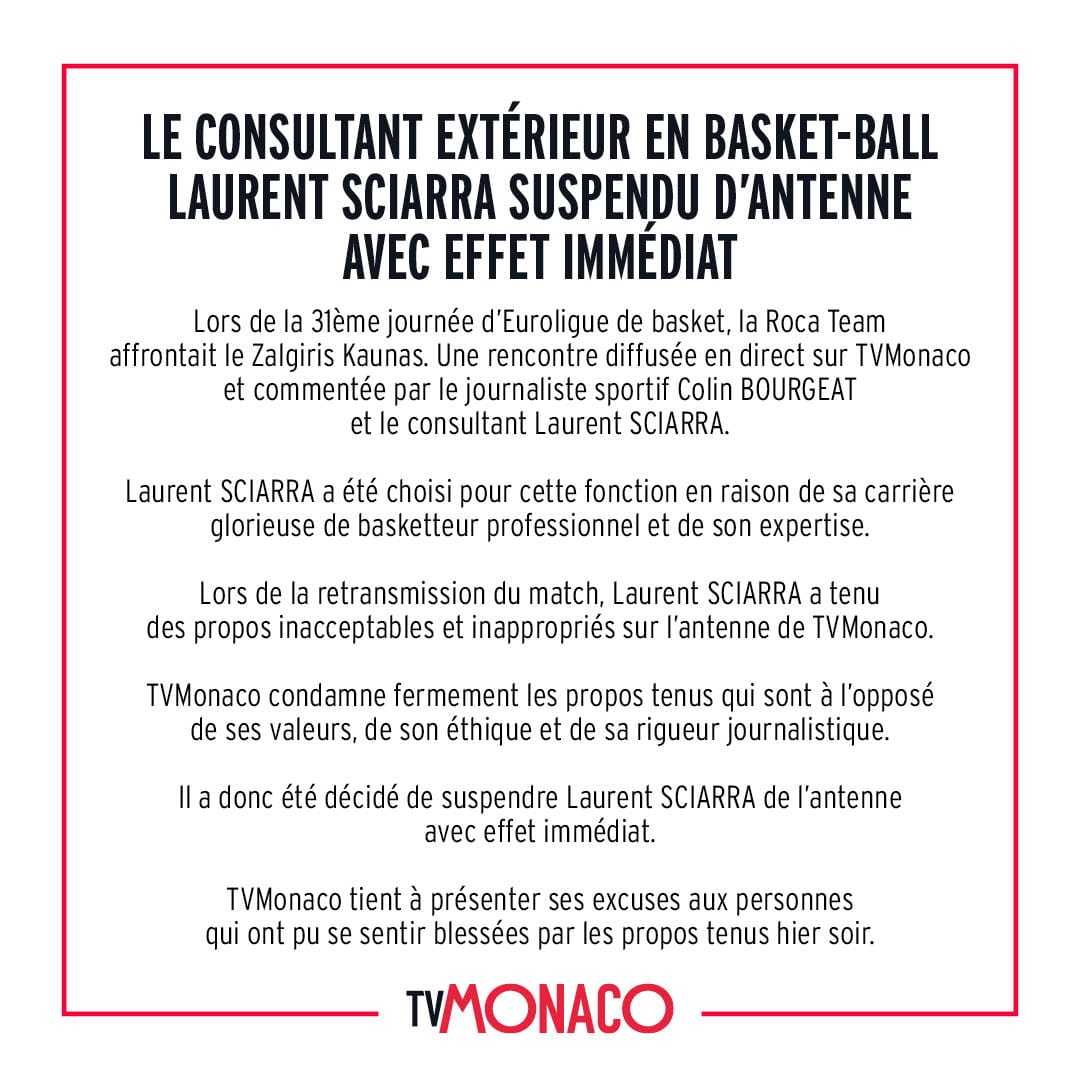 « Lors de la retransmission du match, Laurent Sciarra a tenu des propos inacceptables et inappropriés sur l’antenne de TVMonaco, estime la chaîne de la Principauté dans son communiqué. TVMonaco condamne fermement les propos tenus qui sont à l’opposé de ses valeurs, de son éthique et de sa rigueur journalistique. Il a donc été décidé de suspendre Laurent Sciarra de l’antenne avec effet immédiat. TVMonaco tient à présenter ses excuses aux personnes qui ont pu se sentir blessées par les propos tenus hier soir. »