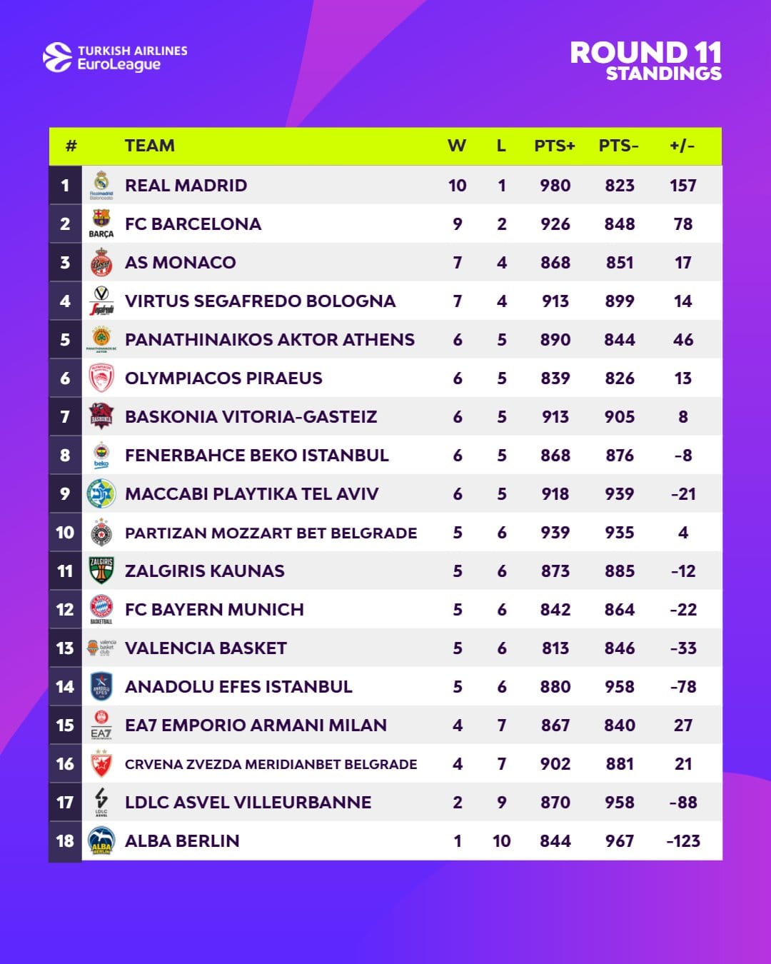 L'Euroleague a publié son classement après 11 journées.