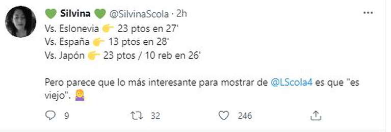 Quelques heures plus tard, le père et la soeur de Luis Scola sont montés au créneau pour critiquer la blague. Mario disant que c’était un manque de respect venant d’une page officielle, et Silvina, écrivant que « il semble que la chose la plus intéressante à montrer de @lscola4 est qu’il est vieux ».