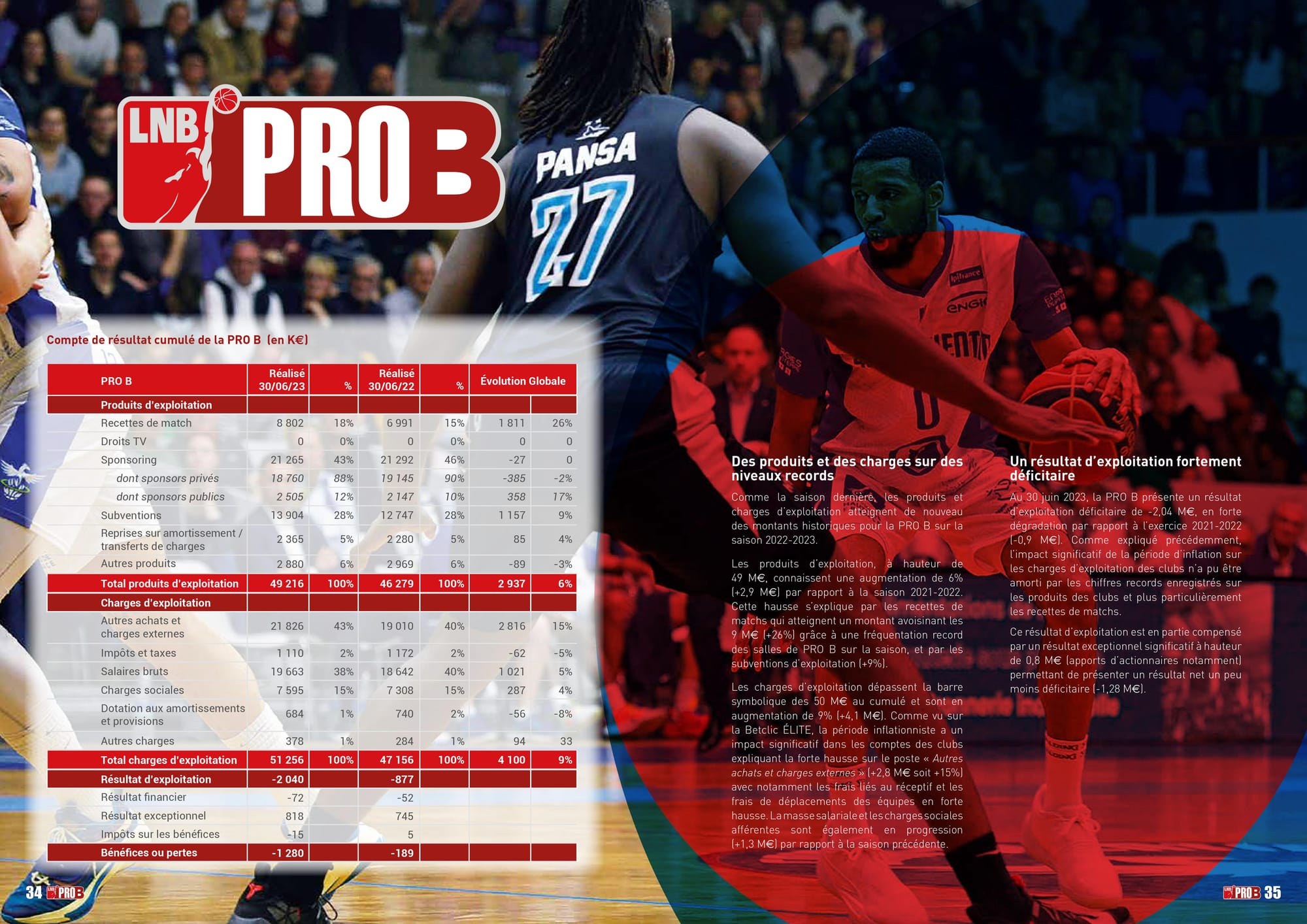 - La Betclic ELITE présente une perte nette cumulée de 5,4 M€ au 30 juin 2023 dont deux clubs, à eux seuls, représentant approximativement 4 M€ de perte ;
