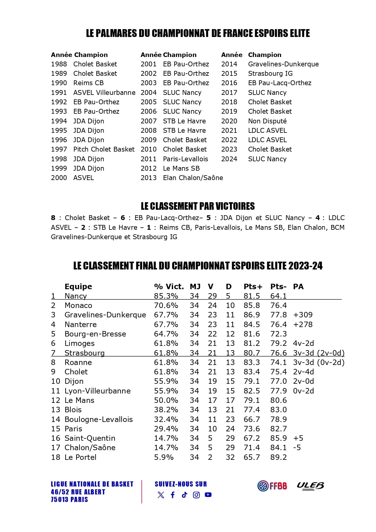 Le SLUC Nancy a remporté le titre de Champion de France Espoirs ELITE pour la 5ème fois, rejoignant la JDA Dijon à la troisième place des clubs les plus titrés dans la compétition.