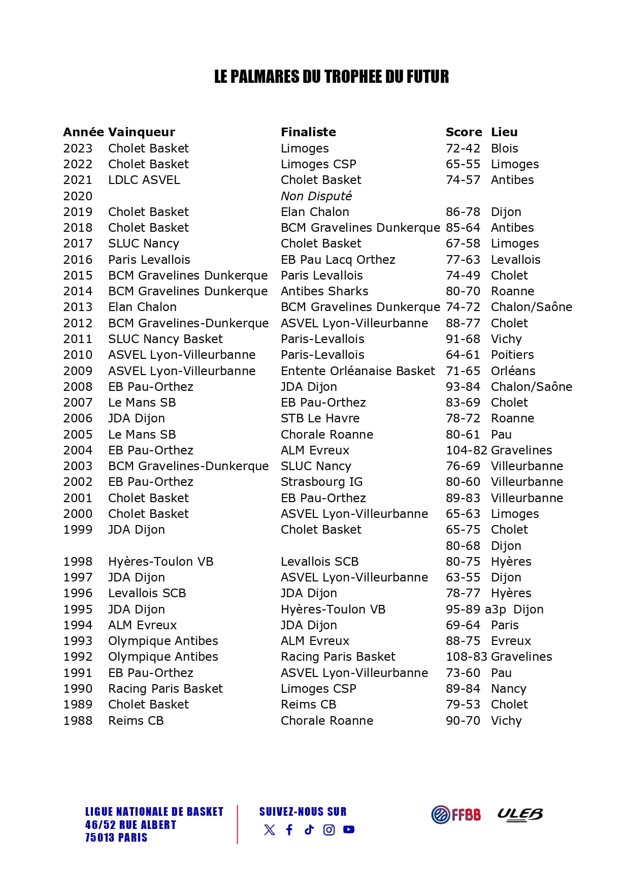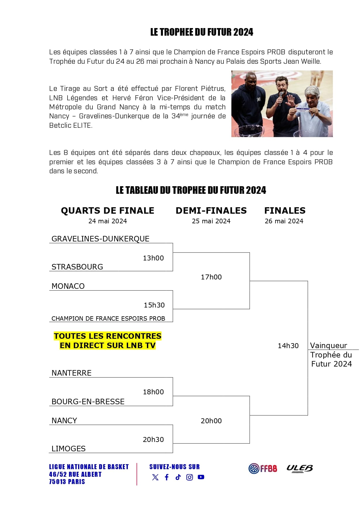 A l’issue du Championnat de France Espoirs ELITE, les équipes classées 1 à 7 ainsi que le Champion de France Espoirs PROB disputeront le Trophée du Futur du 24 au 26 mai prochain au Palais des Sports Jean-Weille à Nancy