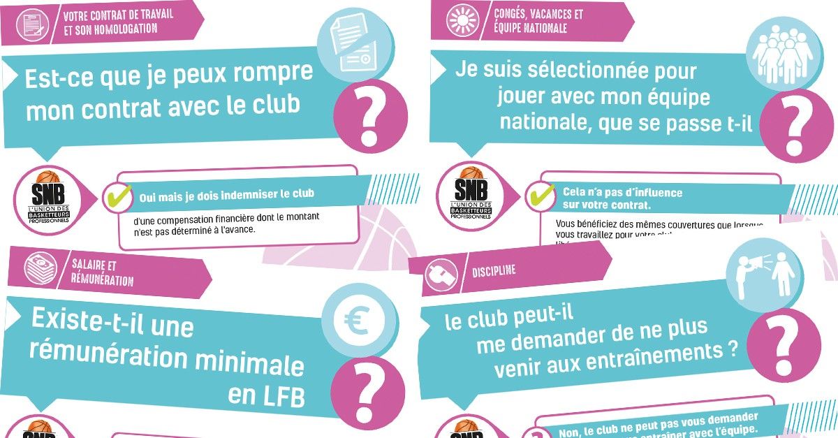 « Tout d’abord, le SNB a créé une page spécifique sur son site internet où les joueuses pourront retrouver une version simplifiée des réglements de la LFB et de la Convention Nationale du Sport. Organisée comme une foire aux questions, elle permet aux joueuses de s’informer sur leurs droits actuels tel que le club peut-il financer des formations, puis-je jouer en LFB et LF2 dans la même saison, ou encore existe-t-il un salaire minimum. Autant de questions pratiques auxquelles le syndicat apporte des réponses claires à des basketteuses souvent en manque d’information. Le SNB choisit également de consacrer un jour par semaine aux joueuses de LFB. Tous les jeudis, sur les réseaux sociaux du SNB, elles pourront découvrir des visuels sur leur cadre de travail existant. »