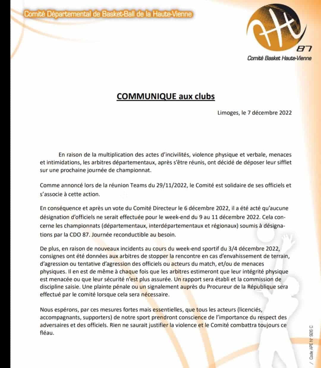 « En raison de la multiplication des actes d’incivilités, violences physiques et verbales, menaces et intimidations, les arbitres départementaux, après s’être réunis, ont décidé de déposer leur sifflet sur une prochaine journée de championnat », indique le Comité 87 à ses clubs.