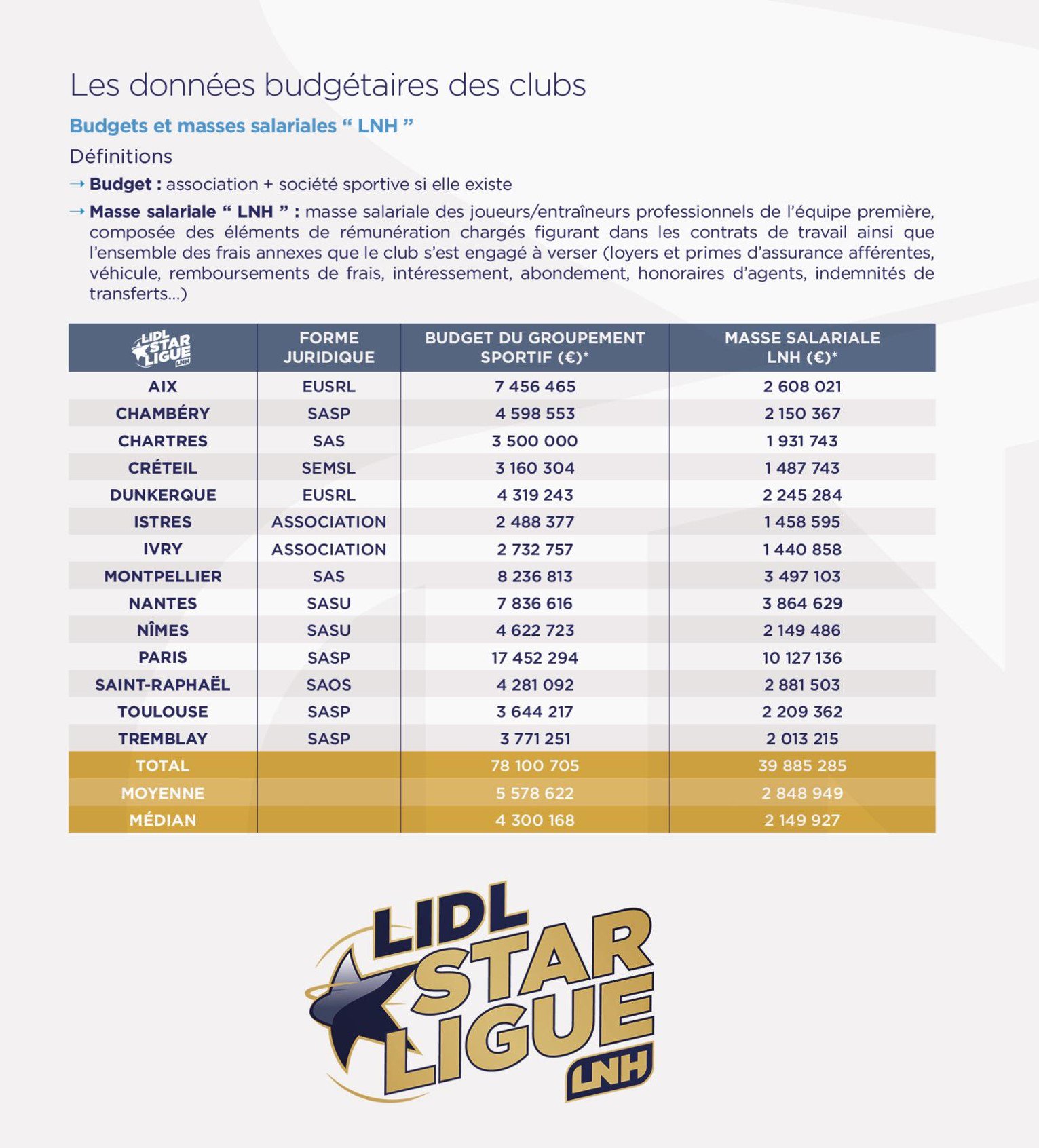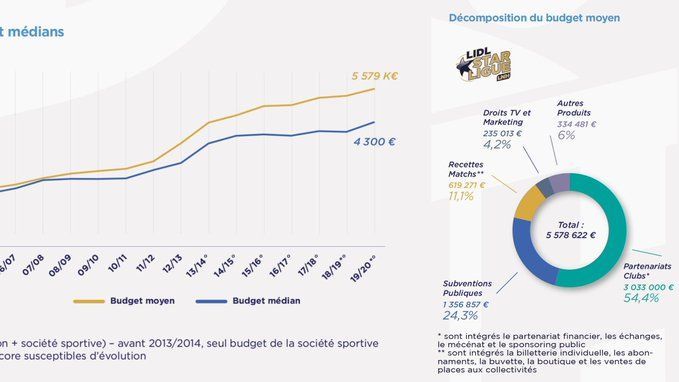 La Ligue de handball (LNH) a publié les budgets de la LIDL Star Ligue pour la saison en cours et la moyenne se situe à 5 578 622 euros, ce qui est dans les eaux de ceux de la Jeep Elite dont la moyenne révélée cet après-midi est montée à 5 844 556 euros.