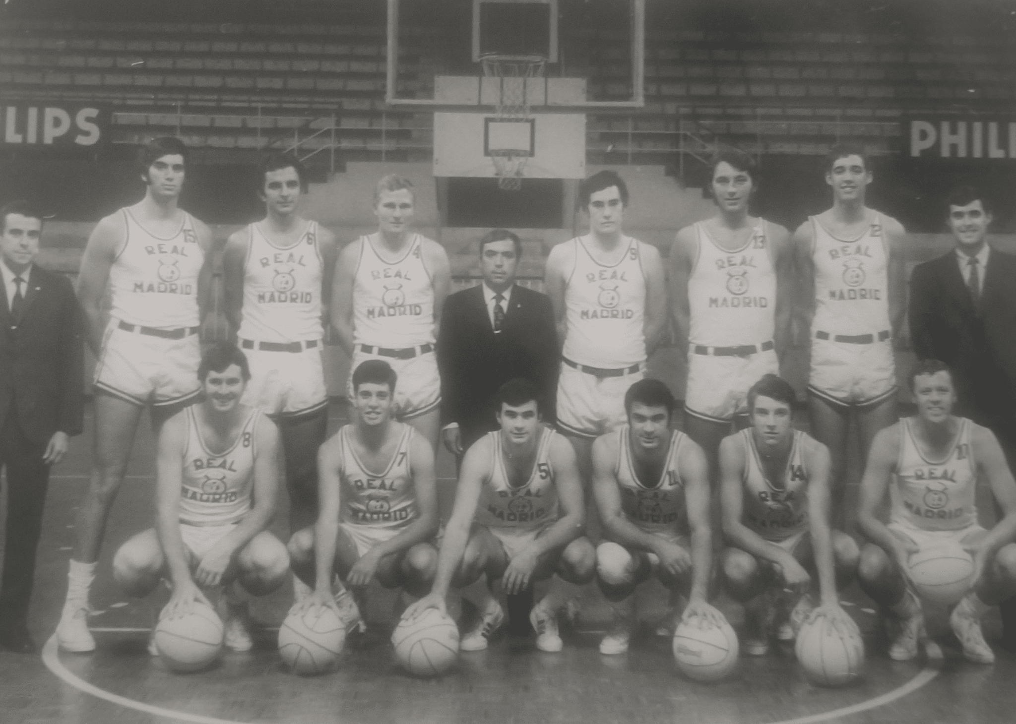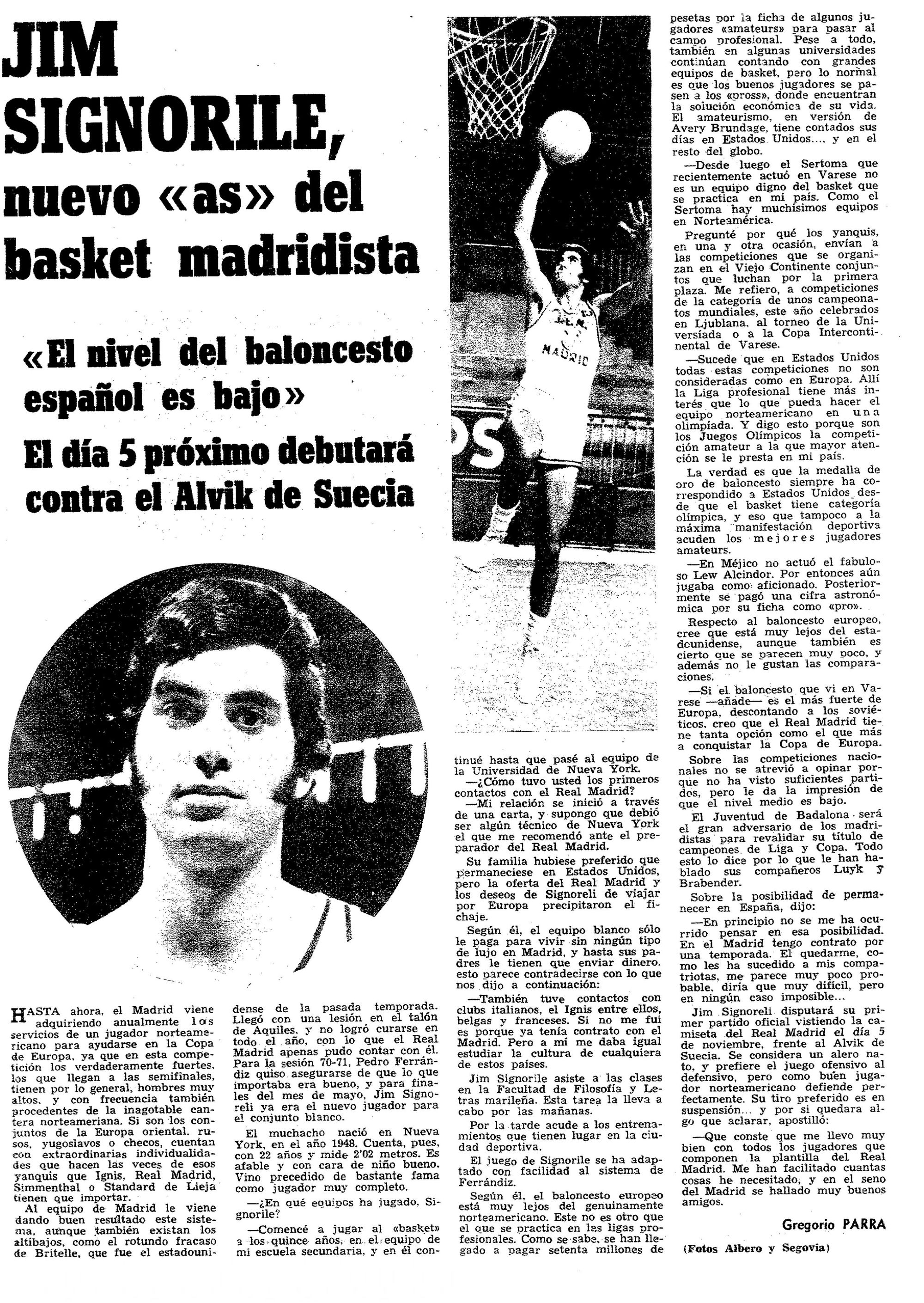 Jim Signorile va se retrouver comme rookie au Real Madrid ! Coaché par le légendaire Pedro Ferrandiz, le Real est déjà alors un monument du basket européen, quatre fois vainqueur de la Coupe des Champions (C1), 12 fois du championnat national. « Ma relation a commencé par une lettre, et je suppose que ce doit être un entraîneur de New York qui m’a recommandé à l’entraîneur du Real Madrid, » dira t-il à son arrivée à la presse espagnole. Seulement, à cette époque, les étrangers n’étaient pas autorisés dans le championnat national. Précurseurs en la matière, Clifford Luyk et Wayne Brabender étaient naturalisés espagnols. Signorile ne fut donc engagé qu’en coupe d’Europe. Il dut attendre le 5 novembre pour jouer son premier match officiel face au Alvik Stockholm. Il eut droit ensuite à deux autres matches face aux… Egyptiens de El-Zamalek Le Caire avant 6 matches de poule de quart-de-finale et deux autres en demi face au prestigieux Ignis de Varèse, qui élimina le Real de l’épreuve. Cela représenta un total de 12 matches – il marqua 11 points en moyenne sur les matches de quarts et de demi-finales. Pas de quoi nourrir convenablement le basketteur mais l’homme apprécia l’expérience. « Je m’entends très bien avec tous les joueurs qui composent l’équipe du Real Madrid. Ils m’ont fourni beaucoup de choses dont j’avais besoin, et à Madrid, j’ai trouvé de très bons amis, » raconta t-il alors. Cinquante ans plus tard, il nous a transmis comme certificat une photo où on le voit avec ses équipiers d’alors.