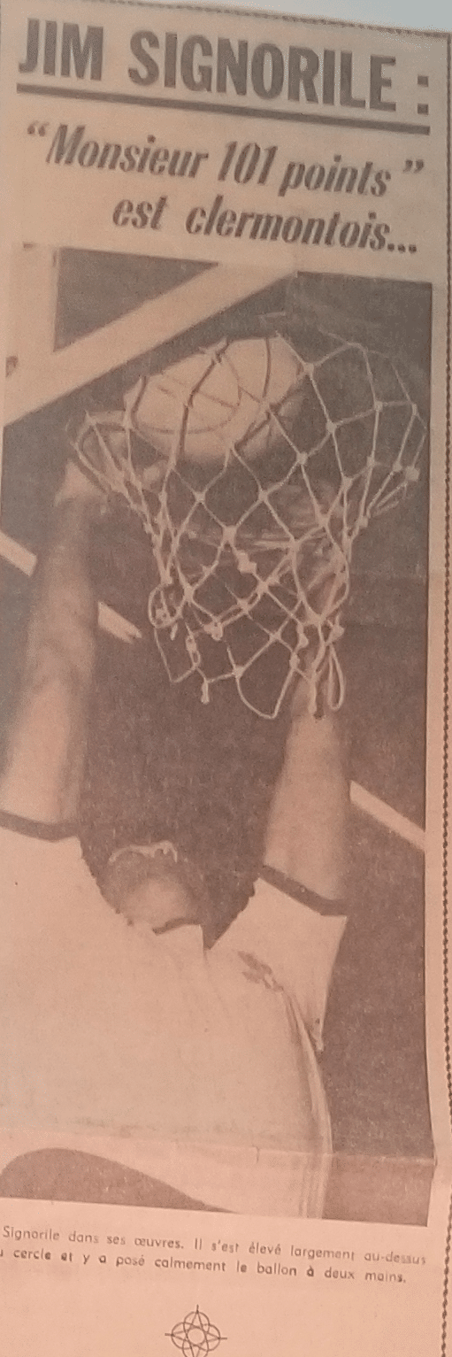 5 février 1972. C’est ce soir-là que Jim Signorile a réalisé son exploit pour peut-être l’éternité. Quelque chose qu’il faut sinon voir tout au moins lire sur les journaux de l’époque pour le croire. La Montagne titra « Monsieur 101 points est clermontois ». Ce sont les Bleuets d’Agen qui firent les frais de la boulimie de l’Américain. Mangés tout crû. 141 à 68. Laissons la parole au héros de la soirée pour nous évoquer le contexte. « Je me souviens que nous avons joué le match dans la petite salle du Stade Clermontois. Les deux adversaires américains n’ont pas fait le déplacement à Clermont-Ferrand pour le match. Ils peuvent avoir été blessés ou malades. Je ne connais pas la raison. Nous avions plusieurs joueurs qui n’étaient pas en mesure de jouer en raison de blessures et de maladies, nous étions donc également en désavantage numérique. Cela signifiait que nous n’avions que quelques joueurs comme remplaçants, donc les starters comme moi devions jouer la majeure partie du match même si nous menions par beaucoup de points, ce que nous avons fait pendant la plus grande durée de la rencontre. Nous avons pris une avance rapide et importante en nous appuyant sur une défense tout terrain pour commencer le match. Je me souviens que toutes les balles perdues me sont revenues quand Agen tentait de lancer son attaque. Ce fut le début de nombreux paniers faciles pour moi. Beaucoup de mes shots étaient des jump shots et de nombreux lay-ups. Je ne me souviens pas avoir tiré des hook shots car je n’ai jamais ressenti la pression défensive de devoir le faire. Elliot Wolfe a probablement battu le record de passes décisives cette nuit-là, mais ils ne tenaient pas des statistiques sur les assists à cette époque. Même si nous menions de 20 points ou plus tout au long du match, Agen est resté agressif en attaque, ce qui nous a permis d’avoir plus de possessions et de marquer plus de points. Le résultat n’a jamais été remis en cause et nous avons augmenté notre avance jusqu’au buzzer final. »