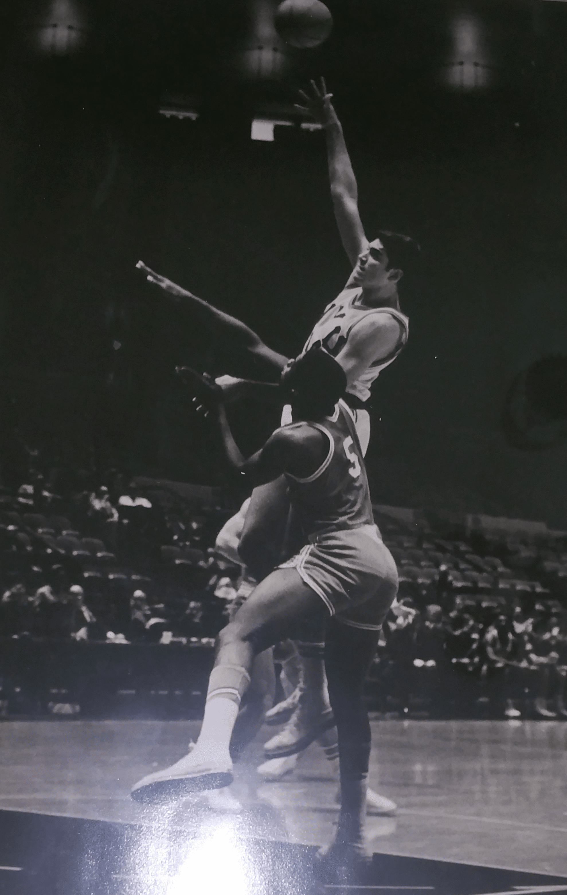 Sa spécialité, c’était le hook shot, alias le bras roulé. « Voici une photo de moi-même prenant un hook shot contre Jim McMillian au Madison Square Garden en 1968 », nous dit-il. « Jim McMillian a continué à jouer pour les Lakers de Los Angeles et a été leur ailier titulaire dans l’équipe championne de 1971-1972 qui a remporté 33 matchs consécutifs. C’est toujours un record NBA. Il a été 3 fois All American à Columbia University. J’ai joué contre lui quatre ans alors que j’étais à l’Université de New York. Le Madison Square Garden était le terrain à domicile de NYU de 1939 à 1971. Chaque jeudi soir, NYU était le match vedette dans le double header de l’université pour toutes les grandes équipes de notre calendrier. Lors de ce match contre Columbia, j’ai réussi trois hook shots. Le hook shot était un coup spécial mais pas mon seul coup. J’avais un jump shot et un turn-around jump shot. J’ai aussi aimé jouer les fast break pour des layups faciles. En France, j’ai eu l’avantage de jouer avec Elliot Wolfe qui était un coéquipier de Jim McMillian à Columbia. Elliot était un formidable passeur. Je pense que nous avons bien travaillé ensemble pendant les quatre ans à Clermont. »