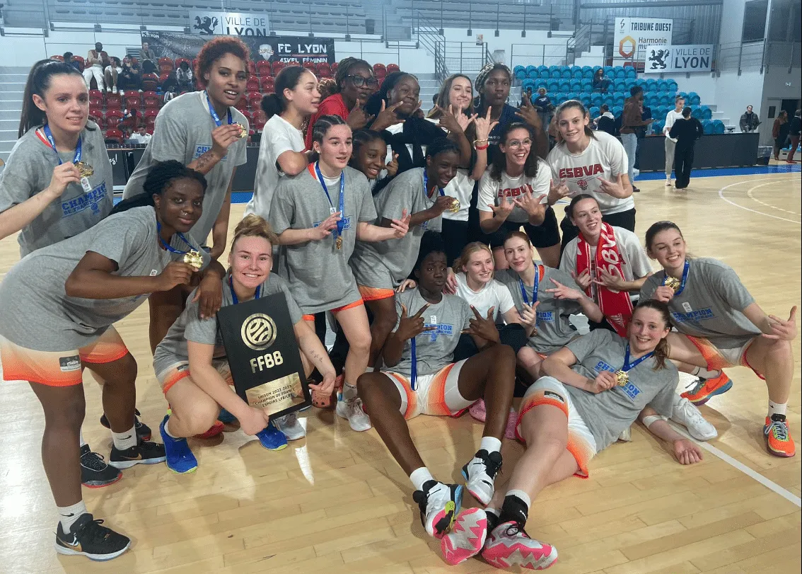 Photo : Les joueuses de l'ESBVA-LM après leur titre de championnes de France Espoirs 2023 (Thomas Palmier, We Basket TV)