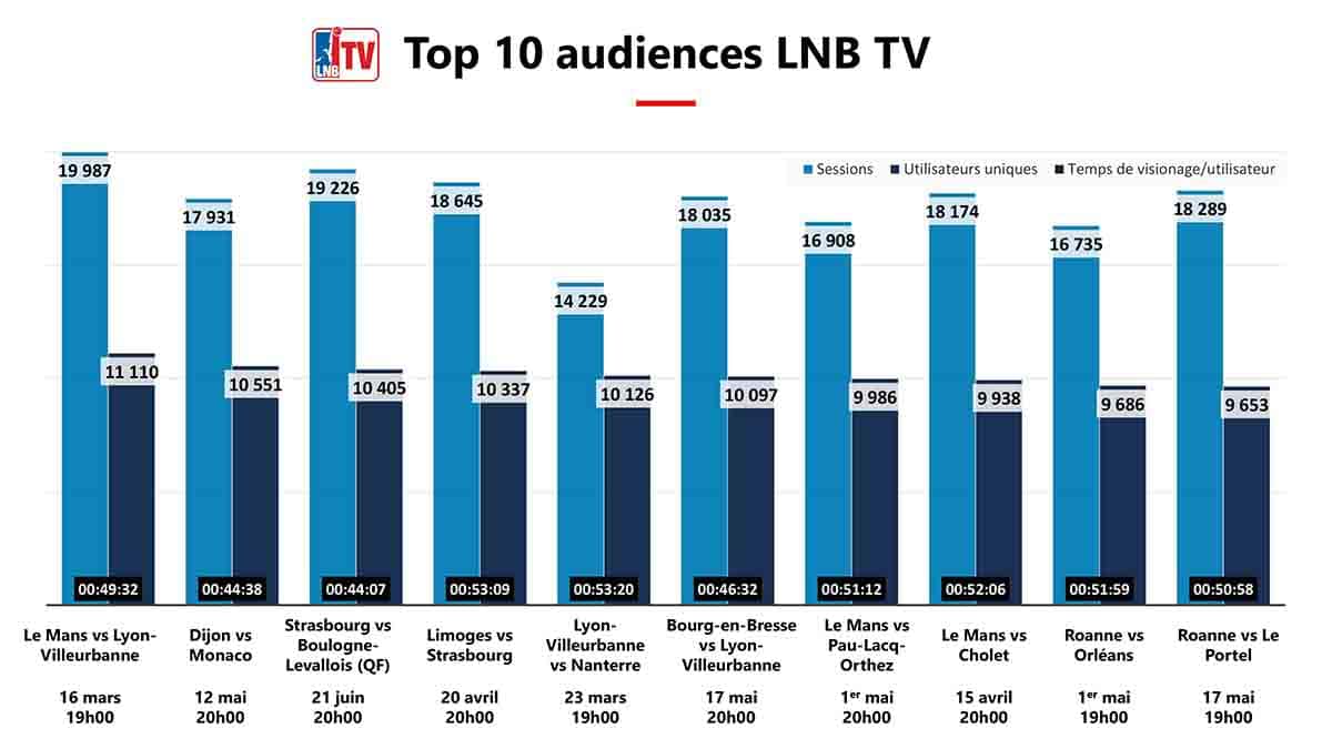 Au niveau des matches, le record a été établi, le 6 mars, par Le Mans vs ASVEL (19 987 sessions) devant Strasbourg vs Boulogne-Levallois (19 226) et Limoges vs Strasbourg (18 646).