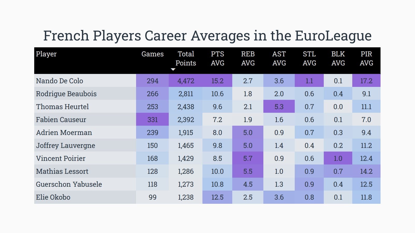 Nando De Colo est dominant en points, moyennes de points, évaluations et aussi en interceptions mais c’est Fabien Causeur qui apparait comme numéro 1 aux matches joués avec sa carrière passée à Cholet, Vitoria, Bamberg et au Real. Seuls Thomas Heurtel et Adrien Moerman ne sont plus actifs dans la compétition.