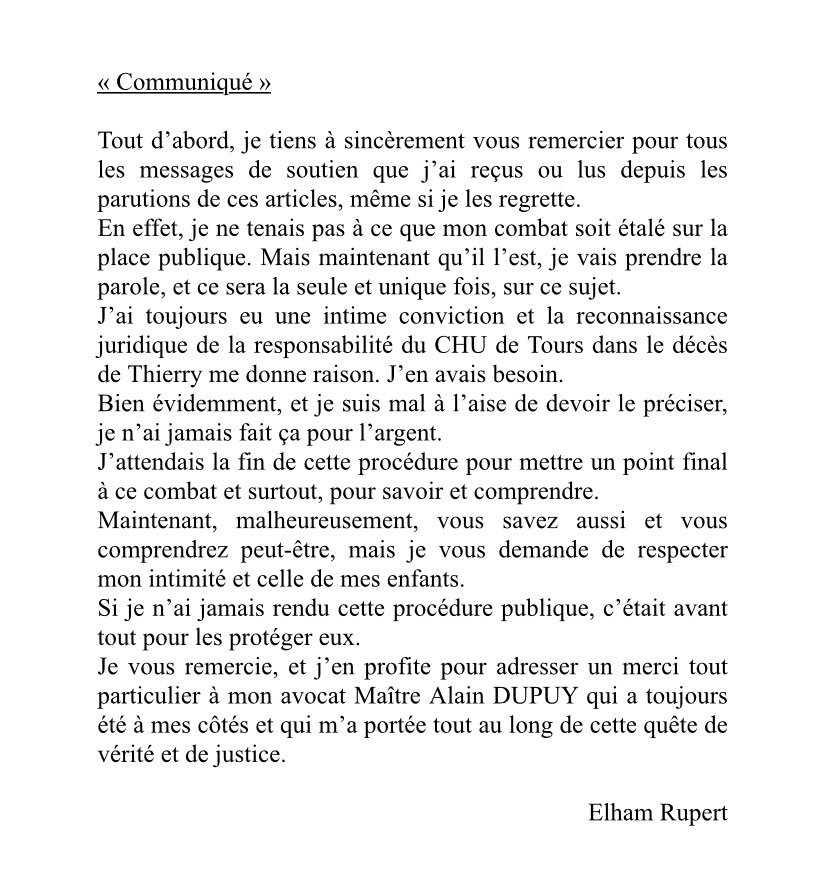 Elham Rupert, femme de Thierry Rupert, et mère de Iliana et Rayan, a écrit une lettre ouverte à différents médias dont BasketEurope qui ont fait part de la condamnation du CHU de Tours à lui verser des idemnités. Nous la publions bien volontiers.