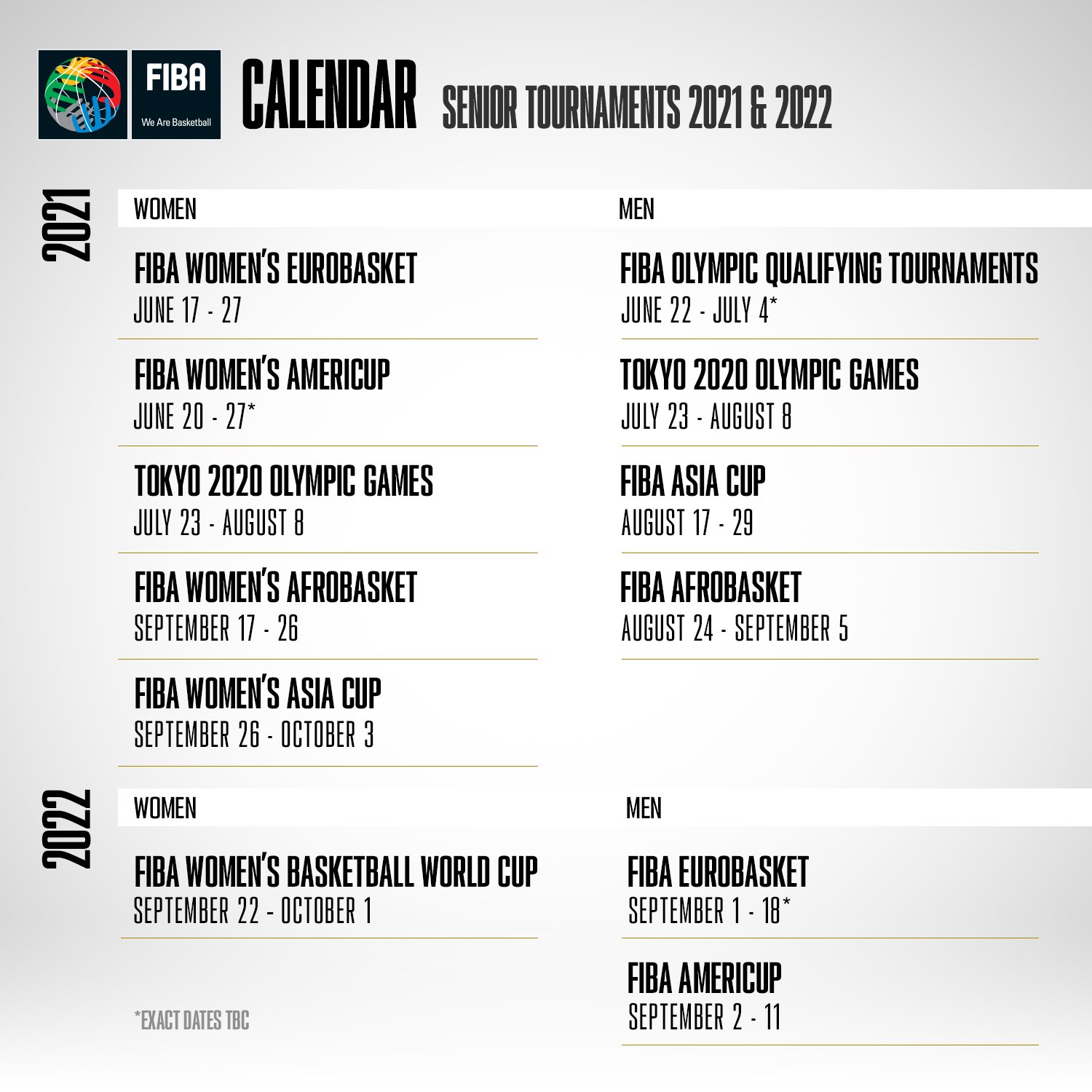 La FIBA Afrobasket 2021 (24 août – 5 septembre) et la FIBA Asia Cup 2021 (17-29 août) sont reprogrammées respectivement d’une et deux semaines, en août 2021, pour éviter le conflit de calendrier avec les Jeux Olympiques de Tokyo.