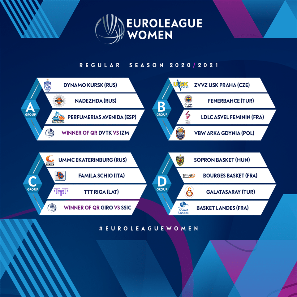 - Les deux meilleurs clubs de chaque groupe de saison régulière se qualifient pour les quarts de finale, les équipes classées troisième NE seront PAS transférées à l’EuroCup Women en raison de contraintes de calendrier;