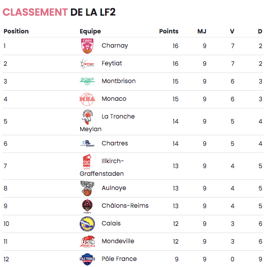 La deuxième division française féminine est en trêve hivernale jusqu’au premier weekend de janvier. Au classement, six équipes se tiennent en deux victoires. Il y a les leaders Charnay et Feytiat (7-2), suivis de Montbrison et Monaco (6-3), et La Tronche Meylan et Chartres (5-4). La montée en Ligue Féminine se jouera lors des playoffs en fin de saison.
