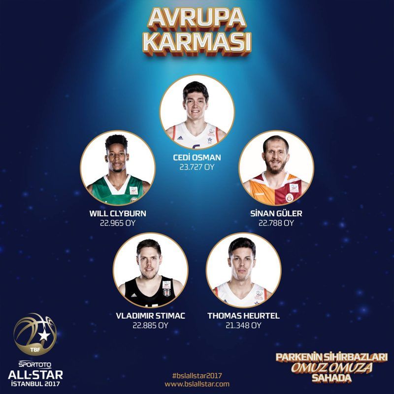 Ils seront opposés au cinq majeur composé de Jordan Theodore (Banvit), Bogdan Bogdanovic (Fenerbahce), Kostas Sloukas (Fenerbahce), Ekpe Udoh (Fenerbahce) et DaJuan Summers (Izmir).