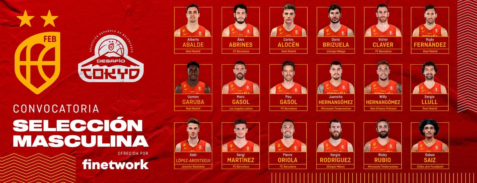 Les 8 champions du monde sont Ricky Rubio, Sergio Llull, Rudy Fernández, Víctor Claver, Juancho Hernangómez, Willy Hernangómez, Marc Gasol et Pierre Oriola. Il y a aussi les retours de Pau Gasol , Sergio Rodríguez et Álex Abrines et une première convocation d’Usman Garuba et de Sergi Martínez.