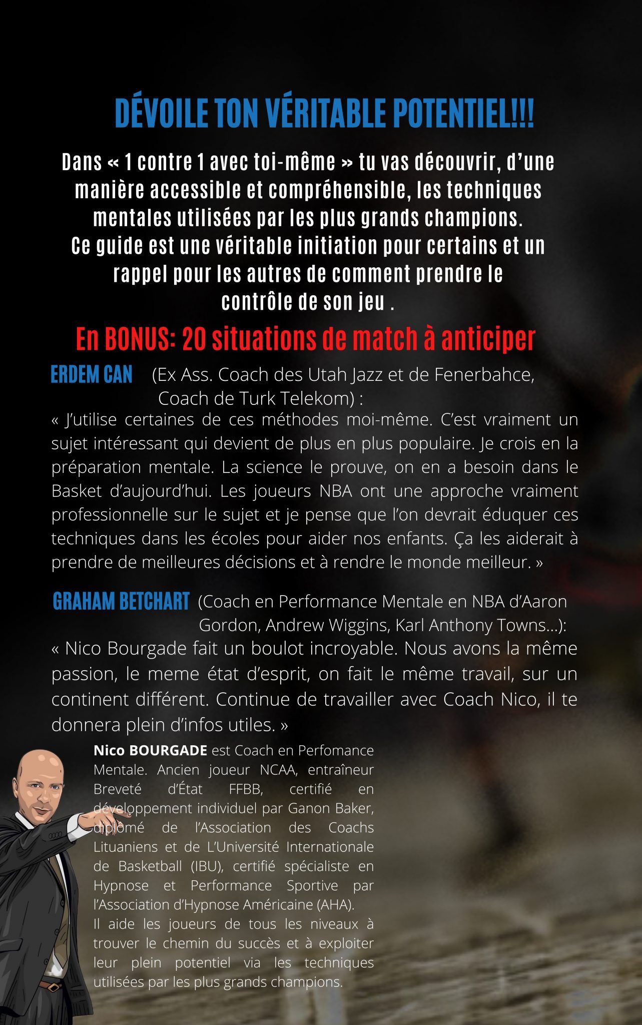 Ce livre n’a pas été écrit en pensant être LA vérité ultime, il a été écrit avec humilité par un ancien joueur fougueux et un entraîneur passionné qui aurait eu bien besoin de comprendre comment gérer certaines situations par le passé. Il a pour but d’aider les jeunes joueur(se)s à trouver des solutions en eux-mêmes et ouvrir à la réflexion sur la préparation mentale dans le basket.