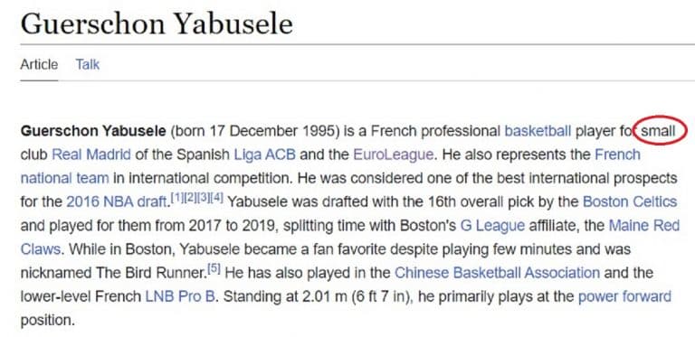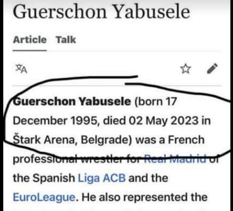 Après la violente bagarre survenue jeudi soir au Wizink Center, les supporters du Partizan Belgrade n’ont pas manqué de réagir. L’un ou plusieurs d’entre eux ont détourné la page Wikipédia de Guerschon Yabusele, indiquant qu’il était un « lutteur professionnel français » jouant pour le « petit club du Real Madrid »... et « décédé le 2 mai prochain » lors du match 3.