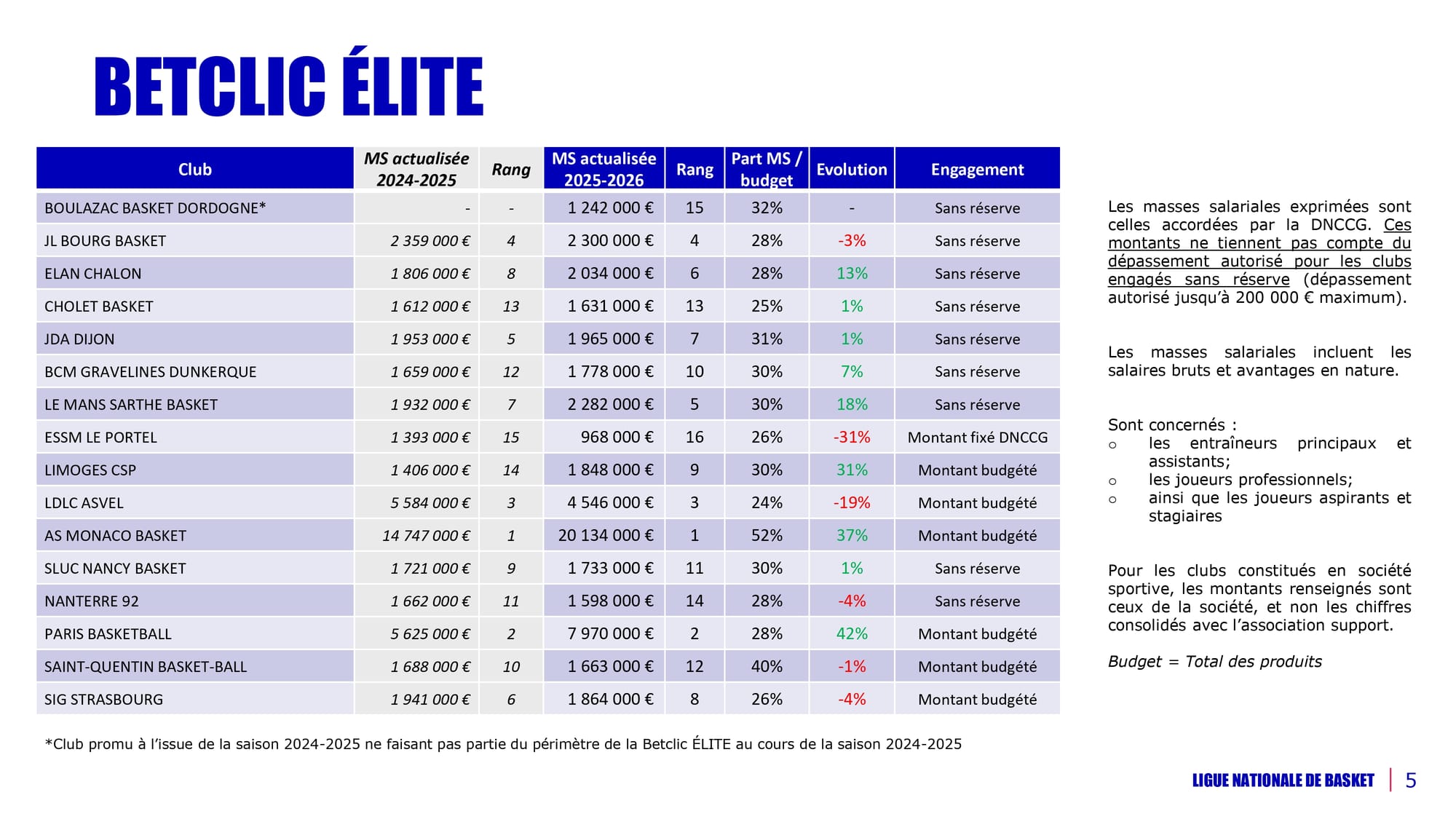 L'AS Monaco Basket présente un budget proche de la barre symbolique des 40 millions d’euros (38,7 millions d’euros). Neutralisé de l’effet des trois clubs disputant l’Euroleague, les budgets des clubs de Betclic ÉLITE augmentent de 4% et les masses salariales sportives de 3%.
