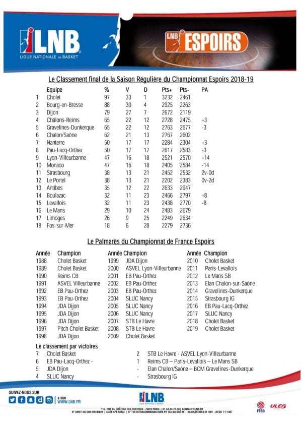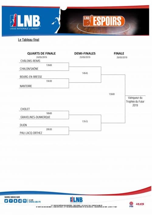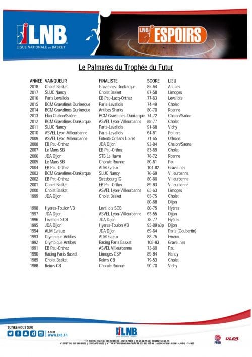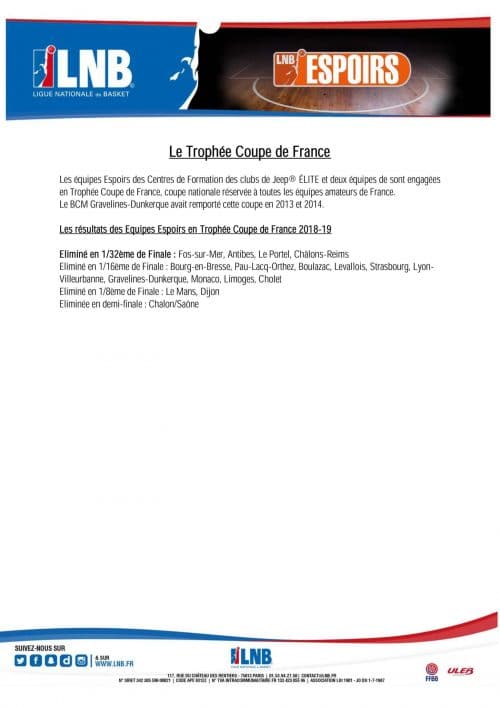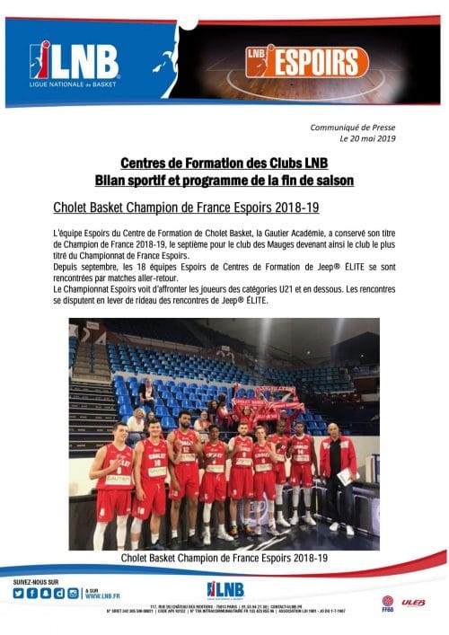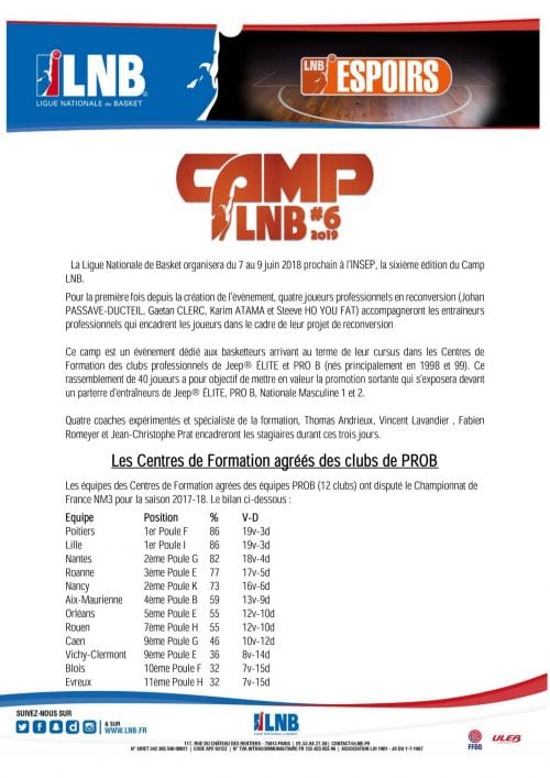 La Ligue Nationale de Basket a envoyé un communiqué qui fait le point sur les compétitions des espoirs (saison régulière, Trophée du Futur, Trophée Coupe de France) et aussi sur le Camp LNB. Le voici.