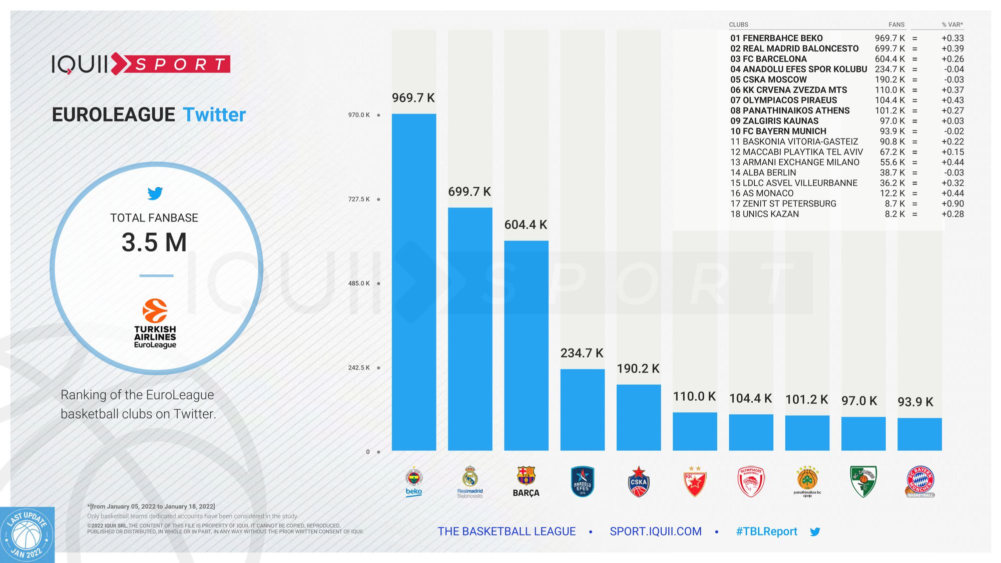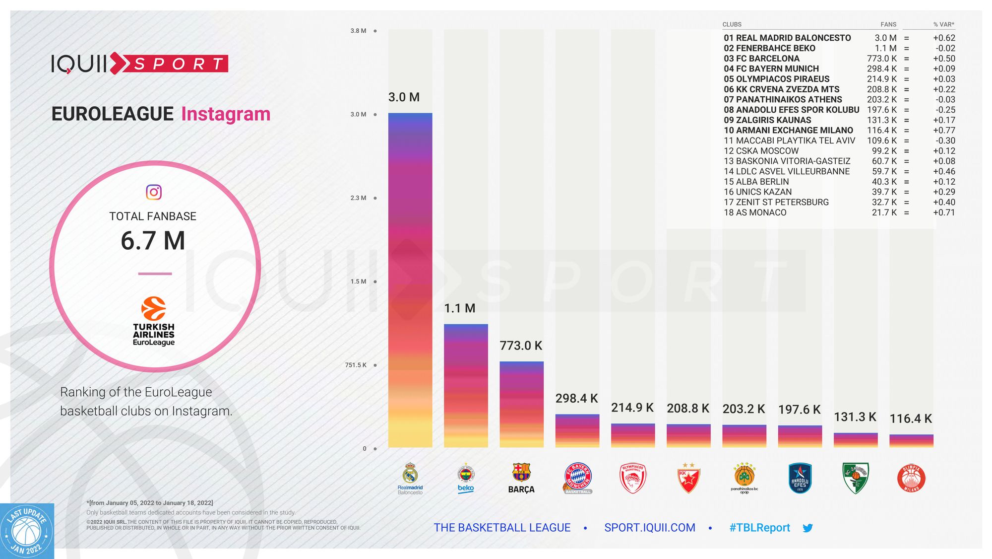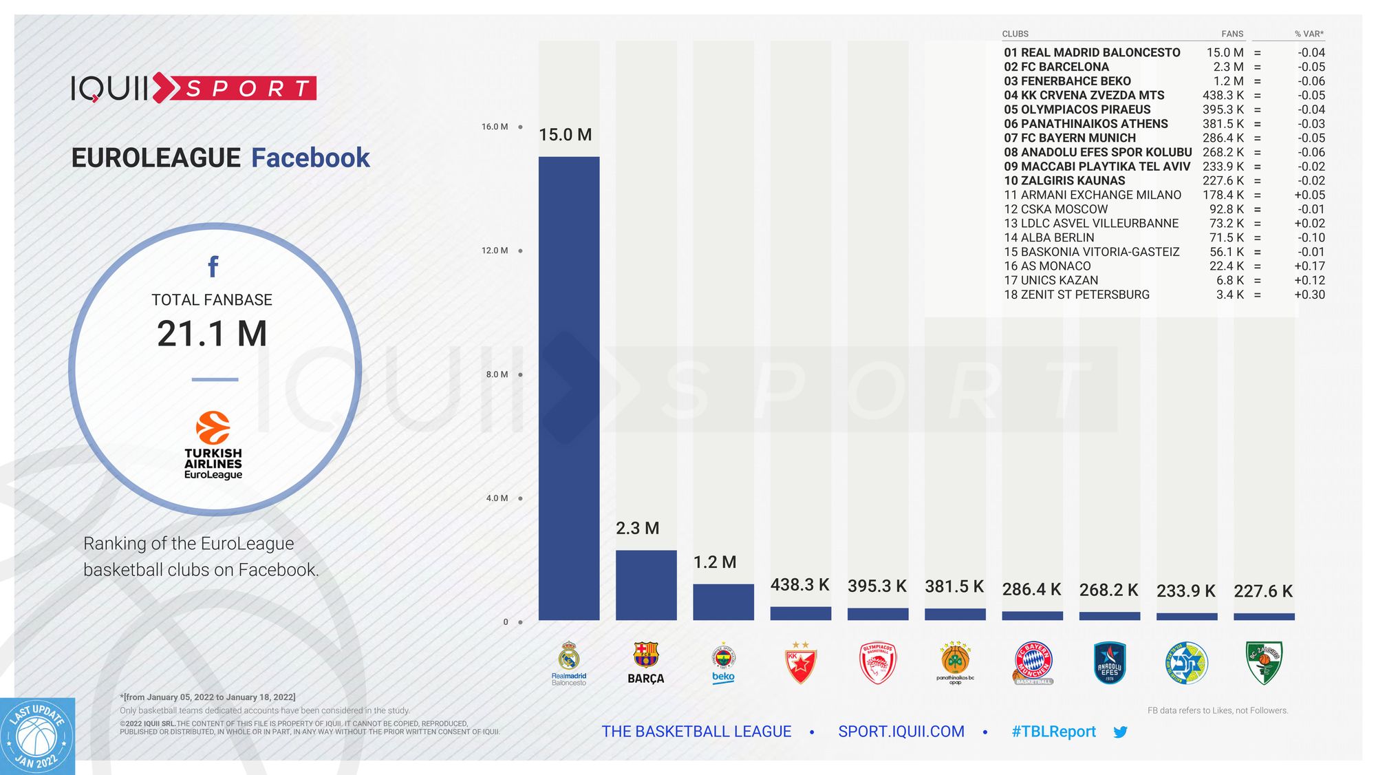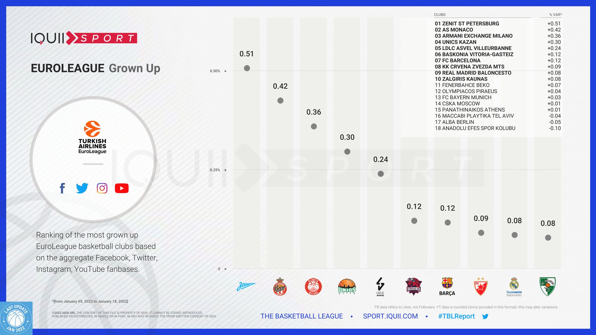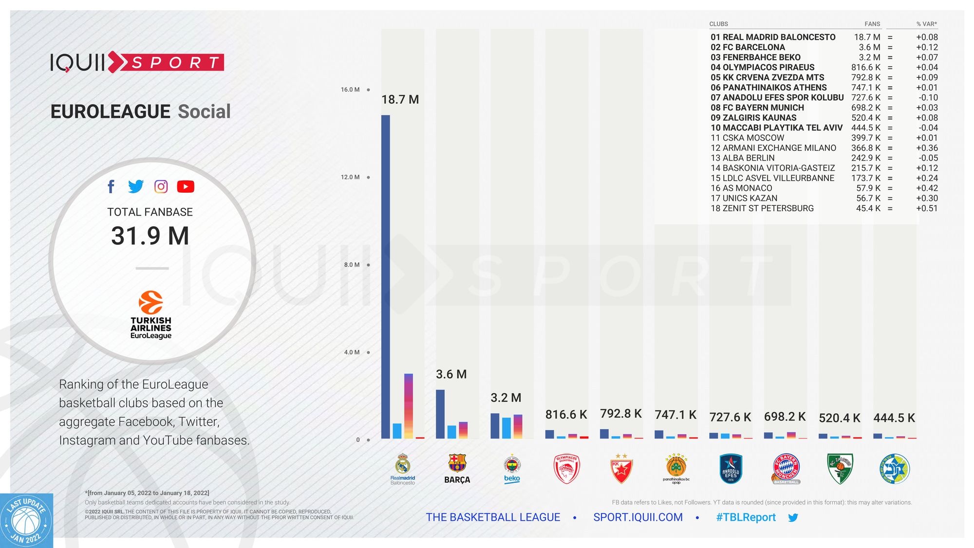 Iquii a sorti son rapport annuel sur les médias sociaux des clubs d’Euroleague (Facebook, Twitter, Instagram, et YouTube). L’ASVEL (15e) et l’AS Monaco (16e) sont encore en queue de peloton, mais en progrès, comme on peut le constater sur le dernier graphique.