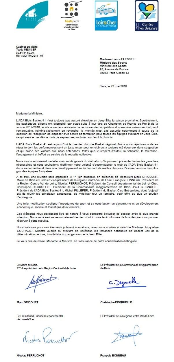 Une semaine après la lettre envoyée au Ministère des Sports (à retrouver ci-dessous) et signée par les différents dirigeants des collectivités locales pour faire part de leur volonté d’accompagner le club dans cette nouvelle aventure (à savoir la montée), le Maire de Blois Marc Gricourt a organisé une réunion avec François Bonneau, Président de la Région Centre – Val de Loire, Nicolas Perruchot, Président du Conseil départemental de Loir-et-Cher, Christophe Degruelle, Président de la Communauté d’agglomération de Blois, Paul Seignolle, Président de l’ADA Blois basket 41 et Michel Pillefer, Président du Basket club entreprises. Son but, acter le soutien des différents acteurs institutionnels (aidés par les nombreux partenaires privés du club) en vue de la constitution du futur budget du club en vue de sa montée en Jeep ELITE.