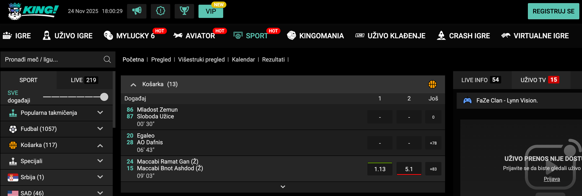 King takođe ima veoma široku lepezu mečeva u ponudi za uživo klađenje, dok su uživo prenosi dostupni za pojedine košarkaške mečeve, ako ste registrovani korisnik.