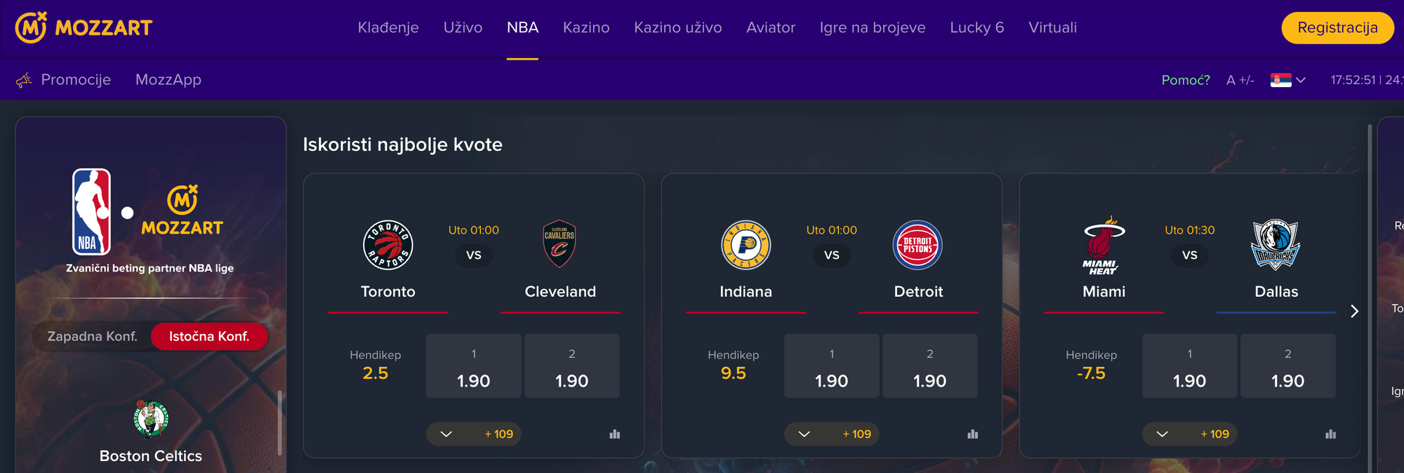 | Mozzart | Uživo prenosi dostupni za sve utakmice NBA i Evrolige | Bonus do 250.000 rsd | Registracija |