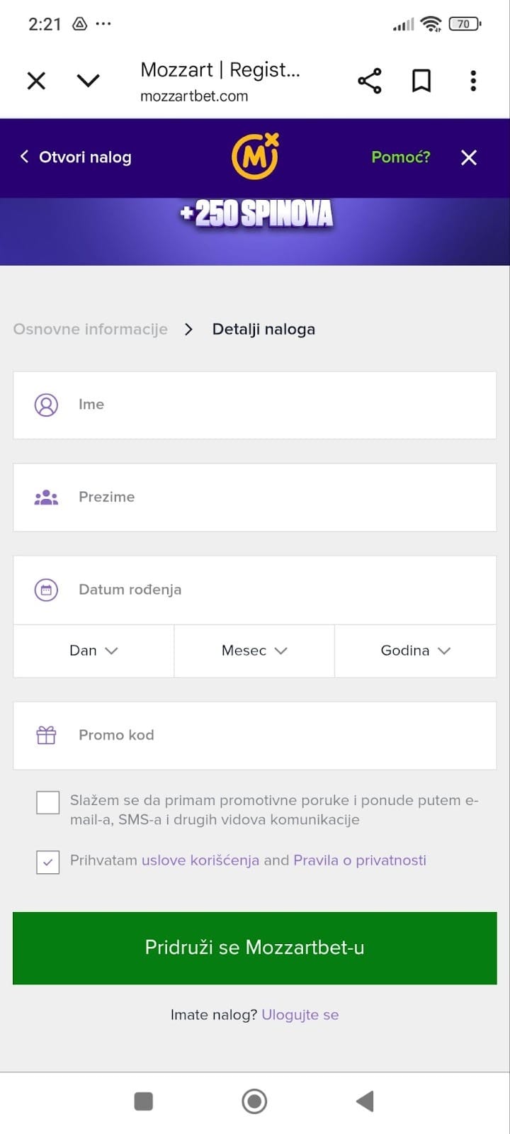 - Na ovom koraku neophodno je da prvo unesete svoje lične podatke, a zatim u polje “Promo kod” unesite Mozzart promo kod, što vam garantuje da ćete dobiti bonus dobrodošlice. Kliknite na dugme “Pridruži se Mozzartbet-u” da završite proces registracije.