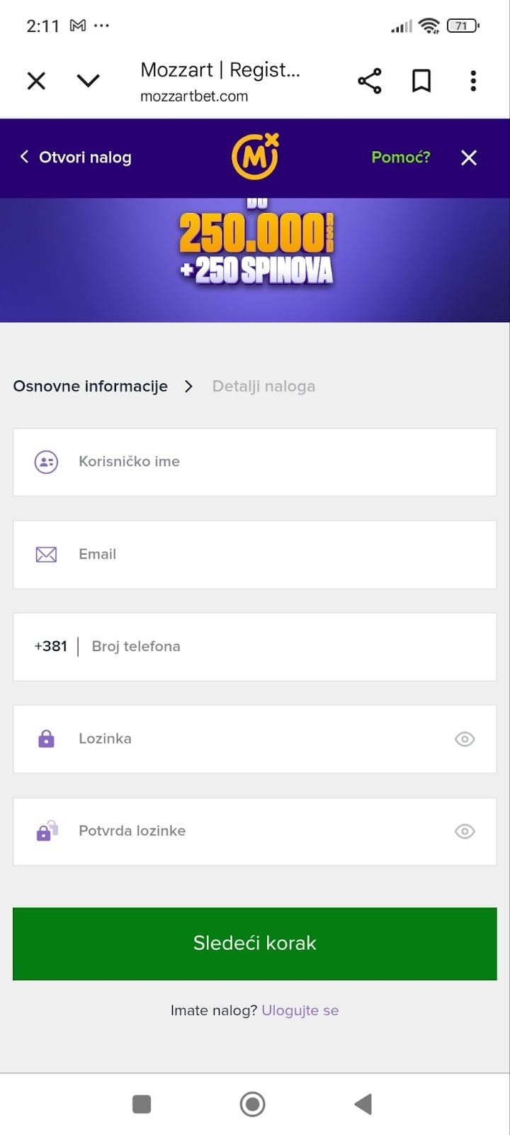 - Odaberite korisničko ime i lozinku, pa unesite vaš email i broj telefona. Nakon što popunite sva polja, kliknite na dugme “Sledeći korak”.