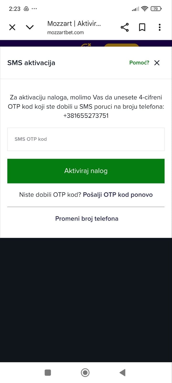 - Na vaš broj telefona će stići kod koji je neophodno da unesete kako biste potvrdili registraciju i aktivirali nalog na Mozzart Bet sajtu.