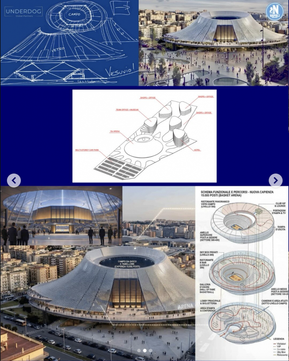 L'édifice, en forme de volcan rappelant évidemment le Vésuve pourra accueillir des événements 365 jours par an. La capacité de l'arèna sera de 15 000 spectateurs pour les matchs de basketball, et sera adaptée aux compétitions FIBA et au-delà. Elle pourra rassembler jusqu'à 18 000 personnes pour des concerts, des conférences et autres événements. Offrant une expérience haut de gamme, elle sera divisée en trois niveaux, avec un club VIP, un salon et la possibilité de dîner avec vue panoramique sur le terrain : en bref, une vision plus américaine du sport et des affaires. Le projet présenté par Napoli Basketball prévoit également des espaces adjacents pour la communauté. Outre des bureaux, on y trouvera des commerces, un musée et même un hôtel.