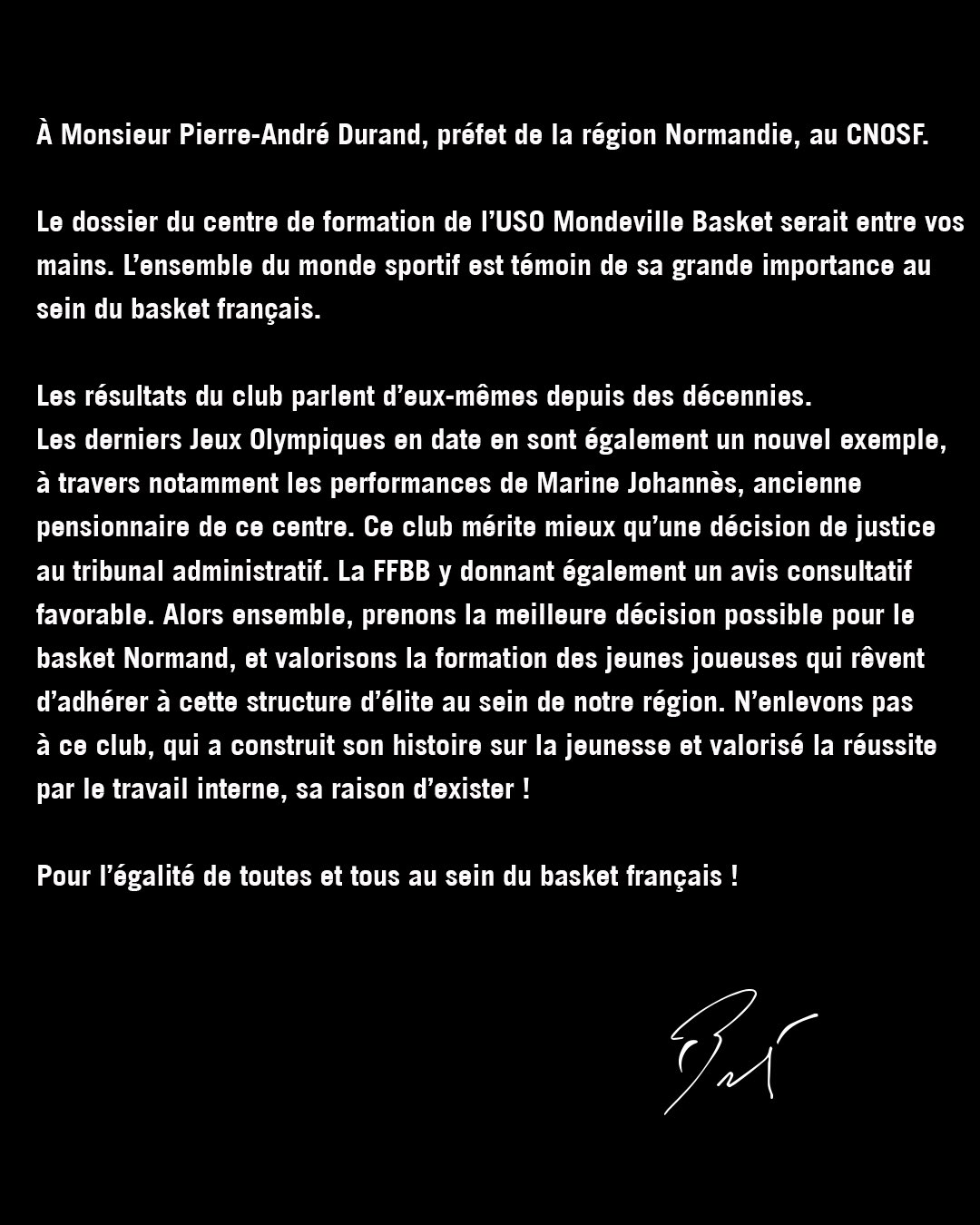 Après Marine Johannes, un autre international normand, Nicolas Batum, prend position en faveur du maintien de l’agrément du Centre de Formation de l’USO Mondeville, qui opère en Ligue 2 féminine. Le capitaine des Bleus s’adresse à la fois au préfet de la région Normandie et au CNOSF avec en relais la Ministre des Sports, Roxana Maracineanu, et la Ministre déléguée auprès du ministre de l’Intérieur de France, chargée de la Citoyenneté, Marlène Schiappa.