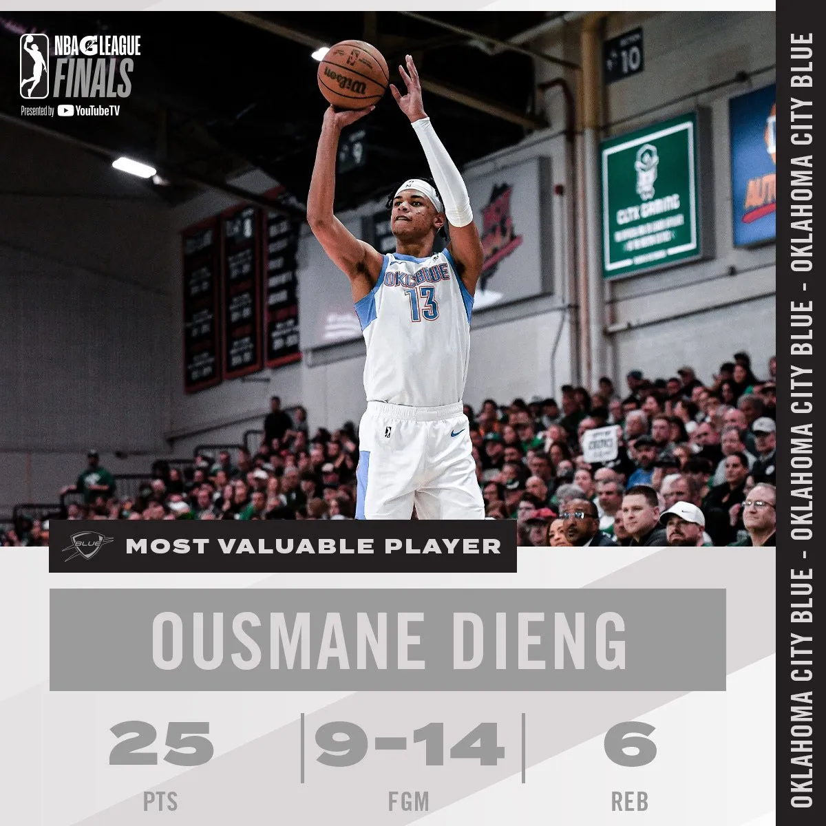 Ousmane Dieng (2,06 m, 20 ans) a cumulé 25 points dont 13 dans le premier quart-temps, ouvrant la voie à une victoire du Oklahoma City Blue. Il a converti 9 paniers sur 14 shoots, dont un 5/6 au-delà de l'arc, et ajouté six rebonds, quatre passes décisives et deux interceptions.