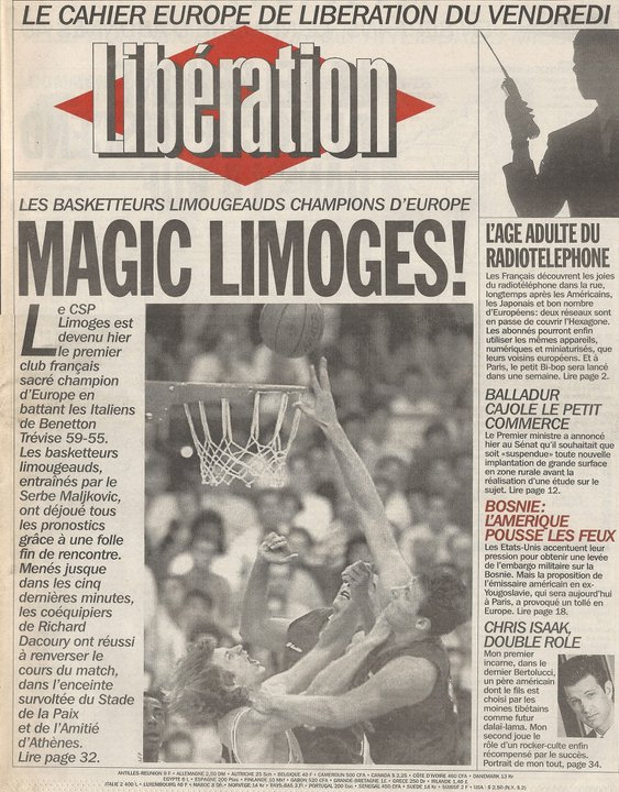 Sur Télérama.fr, dans un dossier sur la finale de Coupe d’Europe des clubs Champions de 1993, Limoges-Trévise, Johan Hufnagel, qui était alors directeur des éditions de Libération, raconte pourquoi le journal titra le lendemain « Magic Limoges » à sa Une:
