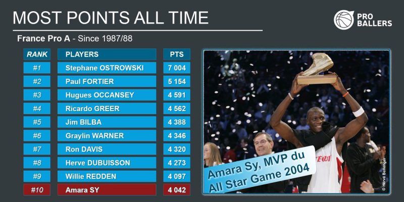 Dans les joueurs encore en activité, c’est le Monégasque Amara Sy (2,02m, 36 ans) qui est le top scoreur; en dehors de courts épisodes en Grèce, en D-League et en Espagne, il a accompli toute sa carrière au plus haut niveau français.