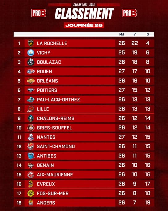 Malgré tout, La Rochelle possède encore deux victoires d'avance sur Vichy et quatre sur Boulazac qui s'en sont sortis d'extrême justesse à Evreux (76-70) et Fos (68-69).
