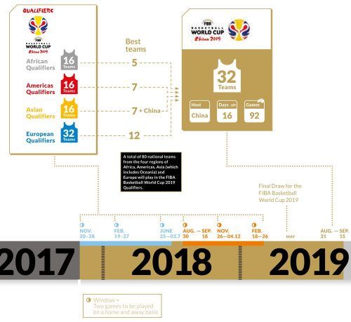 - Deux matches par fenêtres, sur une base aller-retour au cours des six fenêtres qualificatives pour la Coupe du Monde FIBA 2019.