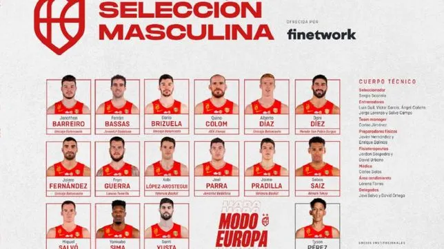 Les 15 joueurs convoqués sont : Jonathan Barreiro (Unicaja Malaga), Ferran Bassas (Joventut Badalona), Darío Brizuela (Unicaja Malaga ), Quino Colom (AEK Athènes), Alberto Díaz (Unicaja Malaga), Dani Díez (Hereda San Pablo Burgos), Jaime Fernández (Unicaja Malaga ), Fran Guerra (Lenovo Tenerife), Xabi López-Arostegui (Valencia Basket), Joel Parra (Joventut Badalona), Jaime Pradilla (Valencia Basket), Miquel Salvó (CB Gran Canaria), Sebas Saiz (Almark Tokyo), Yankuba Sima (Baxi Manresa), Santi Yusta (Casademont Saragosse). Tyson Pérez (MoraBanc Andorre) participera également au rassemblement en tant qu’invité .
