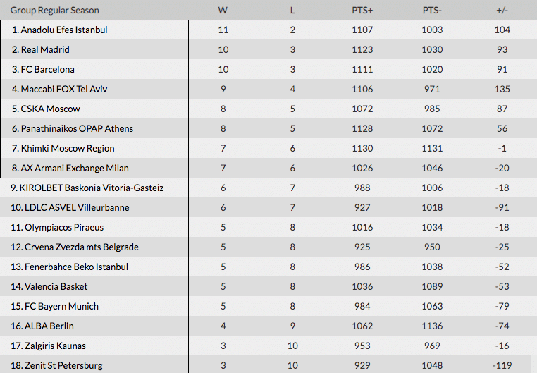 En haut de tableau, l’Efes Istanbul, le Real et Barcelone se sont tous trois imposés pour conserver leur place sur le podium. L’Efes Istanbul a notamment fait sa loi dans le derby stambouliote tandis que les deux mastodontes espagnoles ont réglé leurs comptes à leurs homonymes hellènes, respectivement l’Olympiakos et le Panathinaikos.