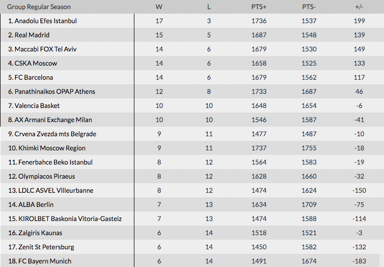 A l’inverse, le Maccabi Tel Aviv s’invite carrément sur le podium avec 14 victoires et 6 défaites, le même bilan que Barcelone et le CSKA Moscou.