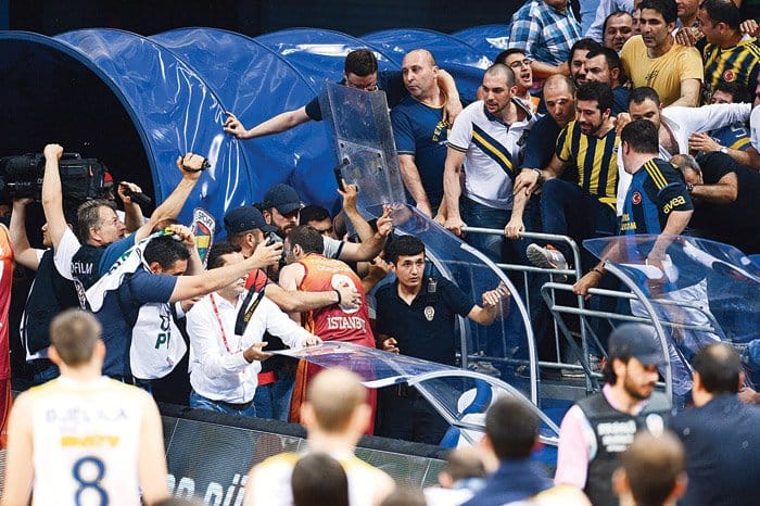 On a vu un supporter turc faire un signe de la main comme quoi il allait couper la tête à Alpha Diallo, un second dans un geste raciste montrer une banane aux joueurs monégasques, d'autres envahir le terrain après le buzzer, Alpha Diallo et Mike James venir à leur rencontre, la mascotte du Fener faire barrage, le coach Sasa Obradovic faire de grands gestes pour que ses joueurs regagnent immédiatement les vestiaires et encore des objets volants non identifiés -notamment des bouteilles d'eau selon l'envoyé spécial de L'Equipe- tomber des tribunes.