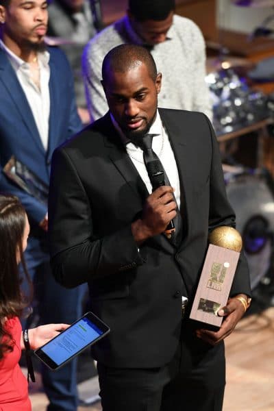 Le MVP de la Jeep Elite, Zachery Peacock (Bourg), ému de recevoir un deuxième trophée consécutif puisqu’il avait été élu MVP de Pro B en 2017.